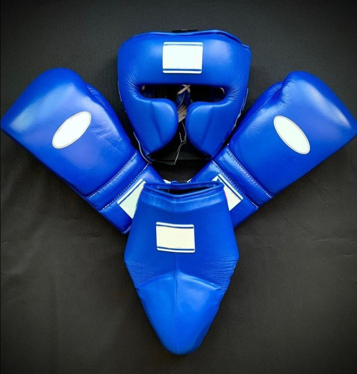 New 2024 Arrival Blue Color Custom Made Winning Training Boxing Sets Leather Boxing Gloves Geadgear Cups